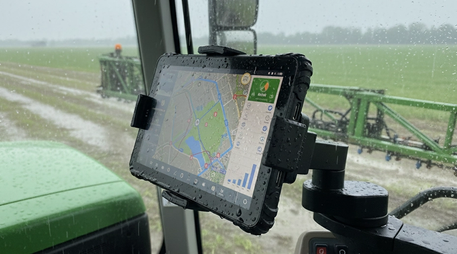 Agricultural machinery operators use waterproof tablets for precision farming, irrigation control, and crop management in wet field conditions and irrigation environments.