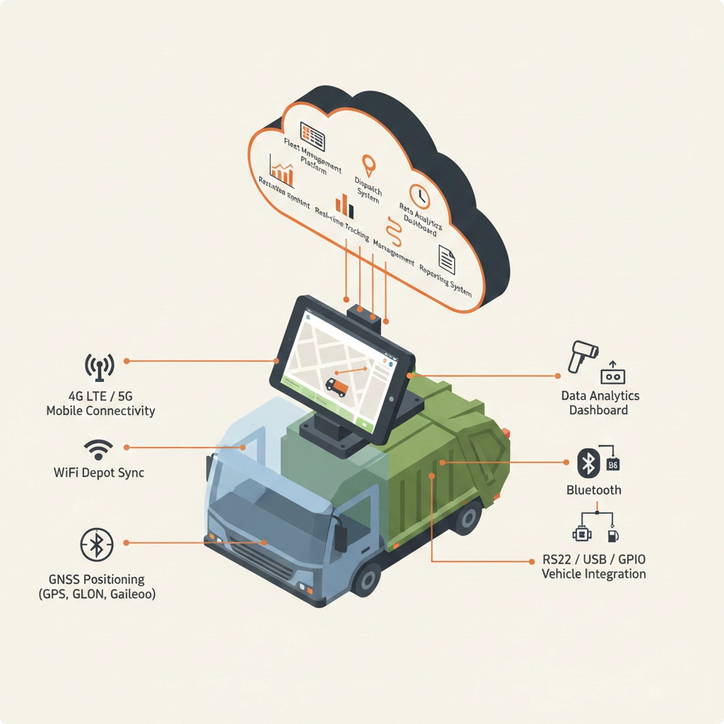 In waste collection fleets, truck-mounted tablets enable optimized collection routes, task execution, driver reporting, and real-time vehicle tracking under harsh outdoor conditions.