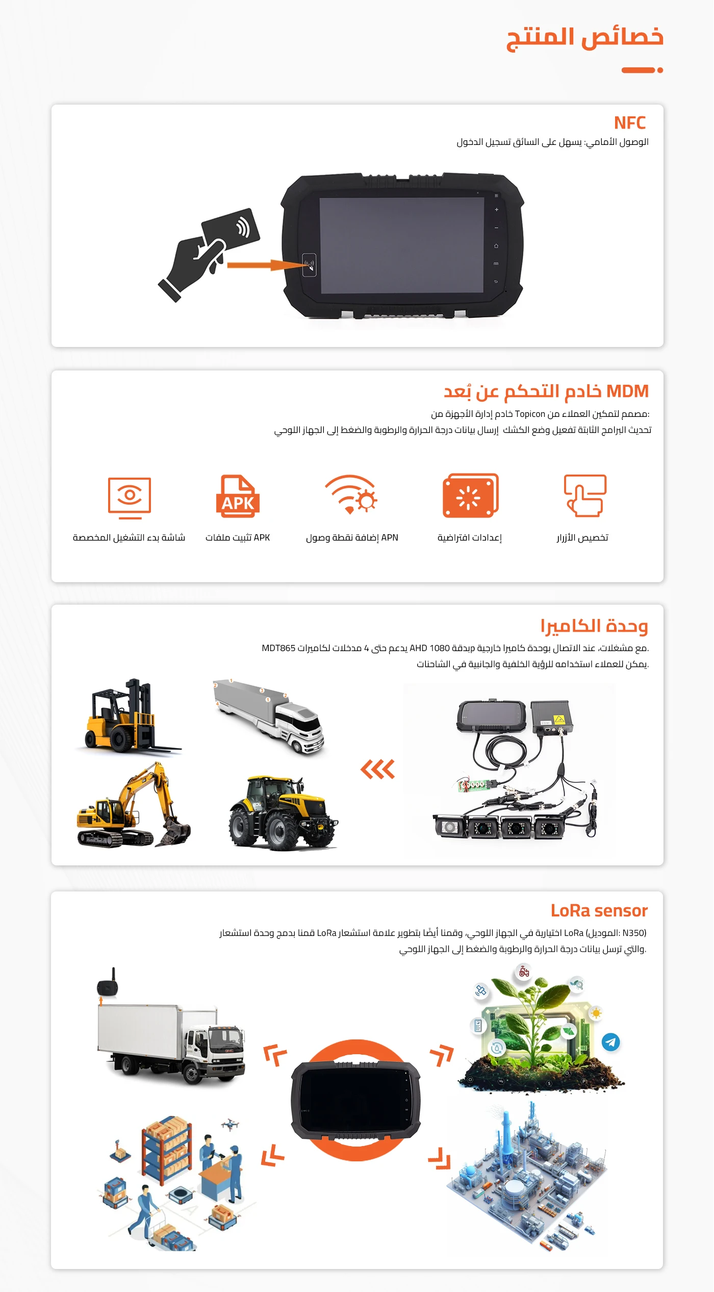 يأتي الجهاز مزودًا بشاشة TFT مقاس 7 بوصات، ووحدة شبكة جوال 2G/3G/4G، وقارئ بطاقات NFC. كما يتوفر خيار LoRa ونظام كاميرا. يدعم الجهاز مدخلات كاميرا AHD بدقة تصل إلى 4×1080 بكسل، وذلك بفضل دمجه مع جهاز TOPICON لمركز الكاميرا، مما يسمح لسائقي الشاحنات باستخدامه للرؤية الواقعية والرؤية الجانبية لضمان السلامة. بفضل حامله المخصص، يدعم الجهاز تبادل البيانات مع واجهة RS232 للمركبة. كما أن شريحة GPS المتطورة تجعل الملاحة أكثر دقة.