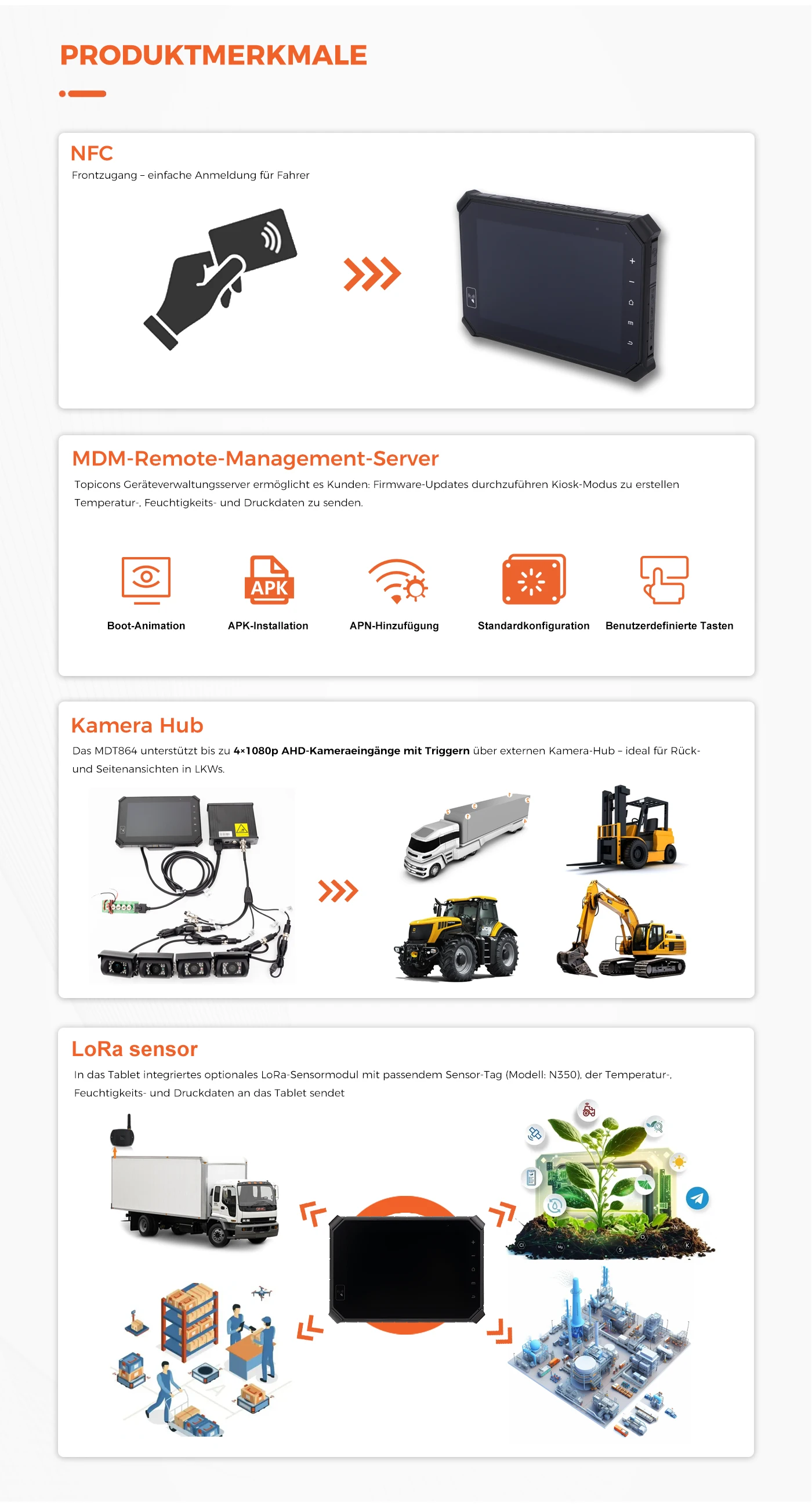 MDM-Fernsteuerungsserver, OTA-Upgrades, Firmware-Anpassung, APK-Integration und Debug-Protokoll.