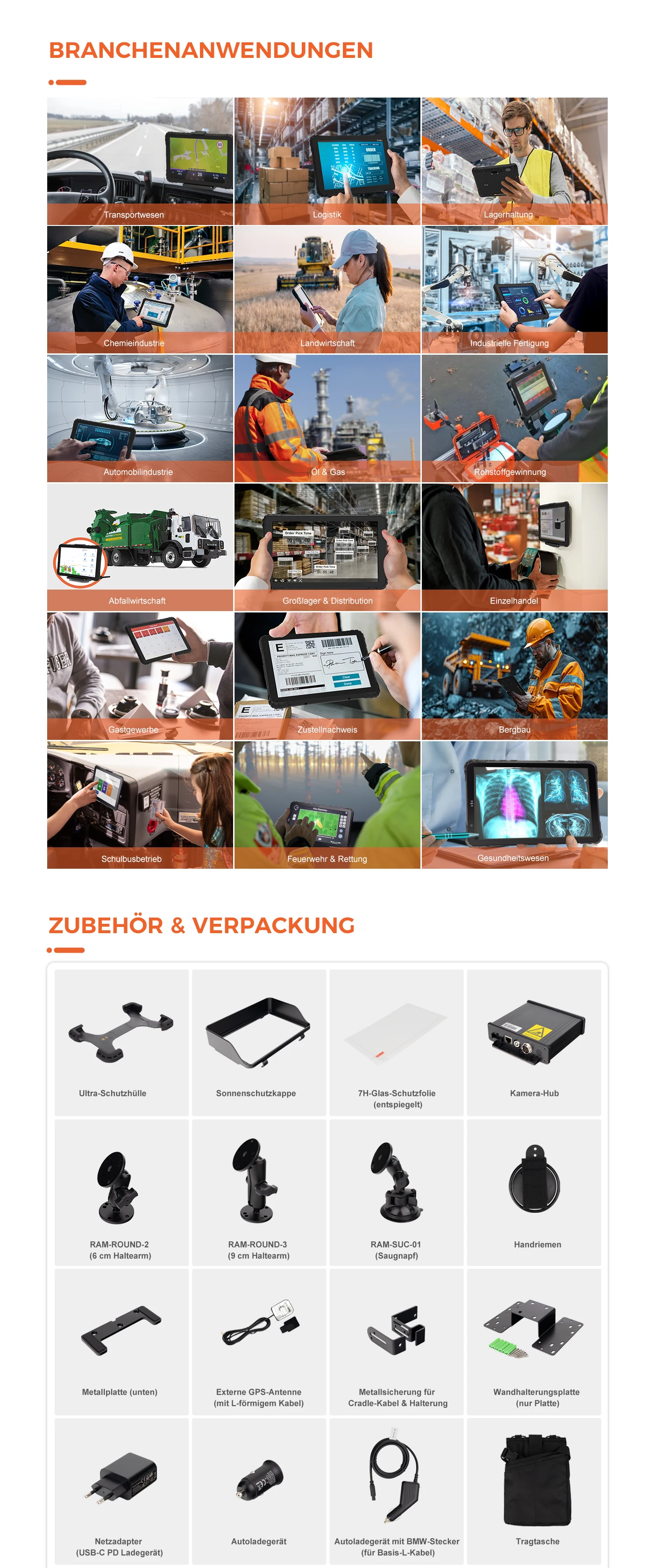 1 Haupteinheit und 1 Halterung (Fahrzeughalterung oder Desktop-Dockingstation). 1 RAM-Halterung, 1 USB-Kabel, 1 Hochleistungs-Autoladegerät, 1 NFC-Karte, 1 Hochleistungs-Heimadapter, 1 Typ-C-Kabel für Heimadapter