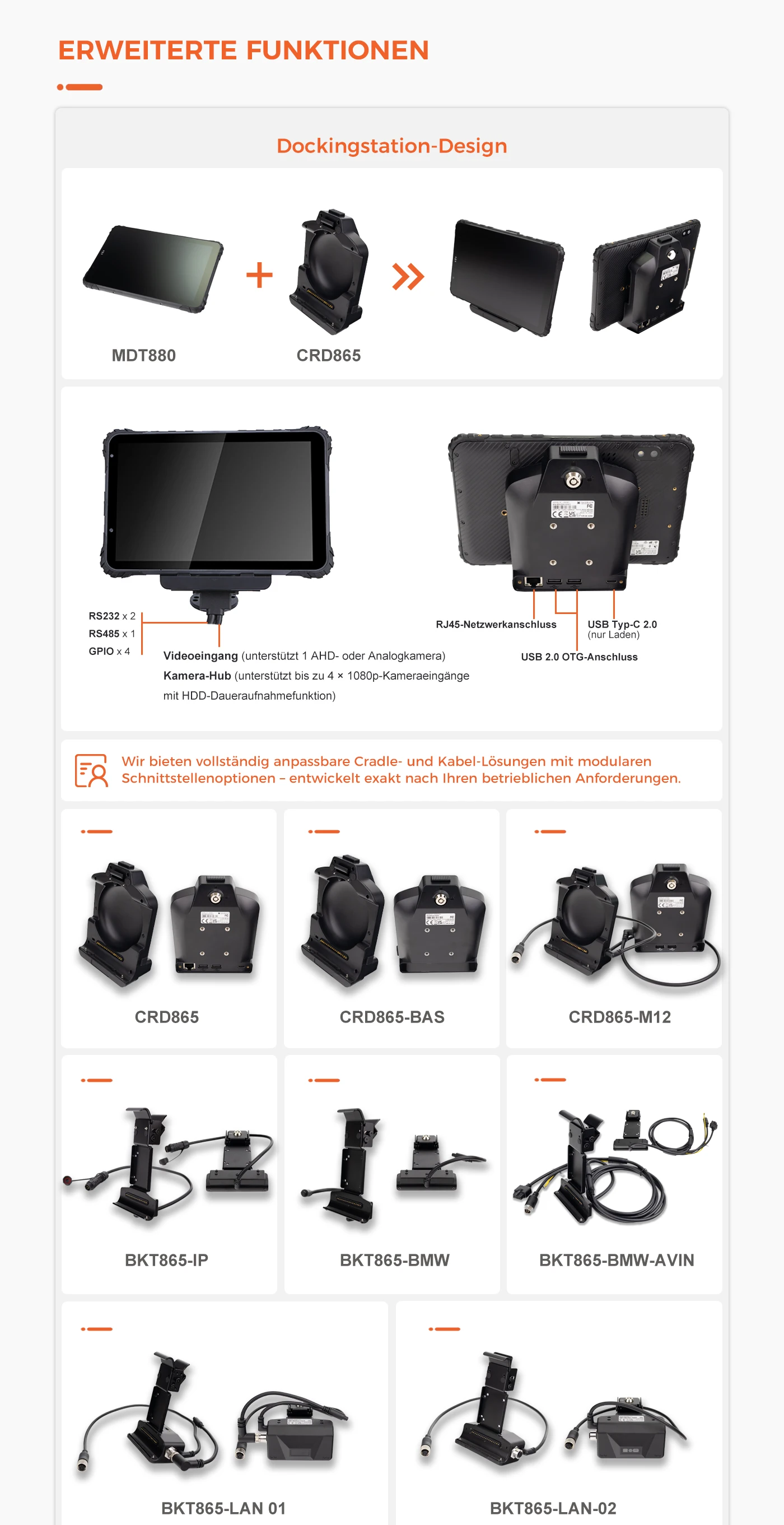 Bei der Halterung gibt es viele Schnittstellen (Ethernet-Anschluss, 2 OTG-Ports, 3 Eingänge, 3 Ausgänge, 2 RS232, 1 RS485)
