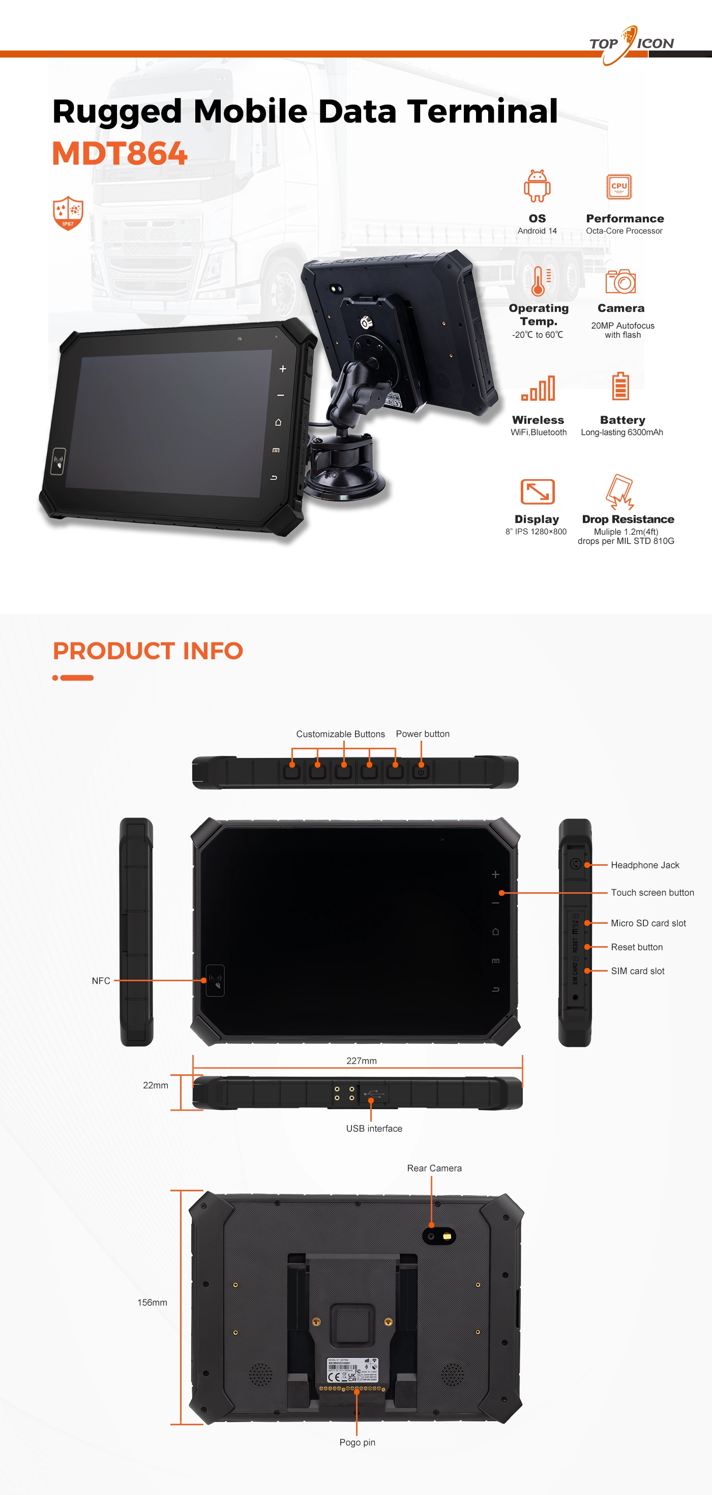 MDT864 is a high-performance tablet terminal with 8" display, IP67 rated. Equipped with octa core processor, advanced GPS chipset, 4G/3G/WLAN module, with RFID, Bluetooth, camera and support hardware customization.