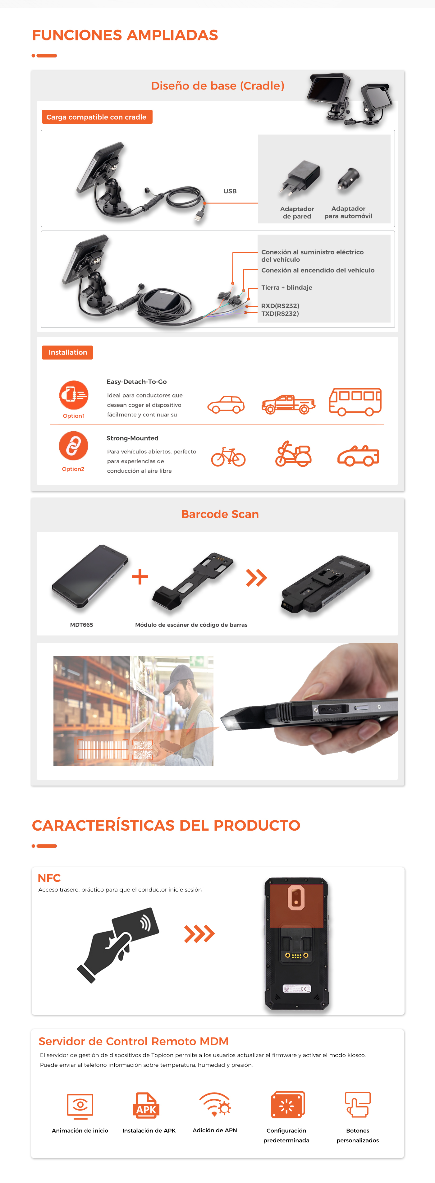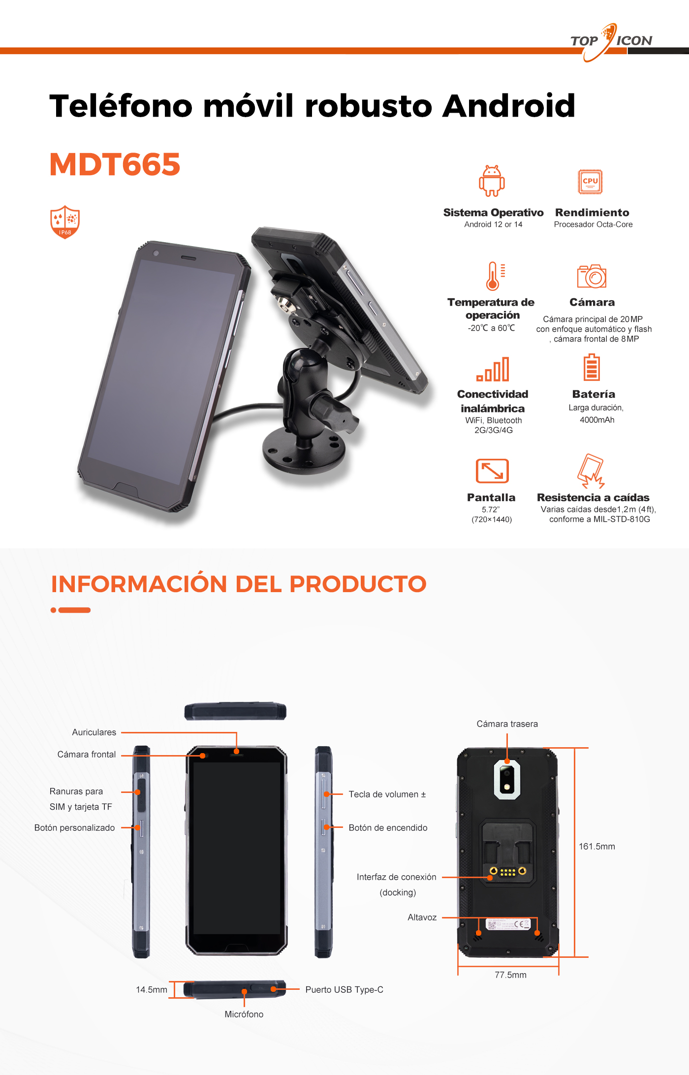 El MDT665 es un terminal portátil Android compacto y robusto de 5,72 pulgadas. Ideal para operaciones de logística, comercio minorista y almacén, compatible con lectura de códigos de barras, bases y soportes de seguridad.