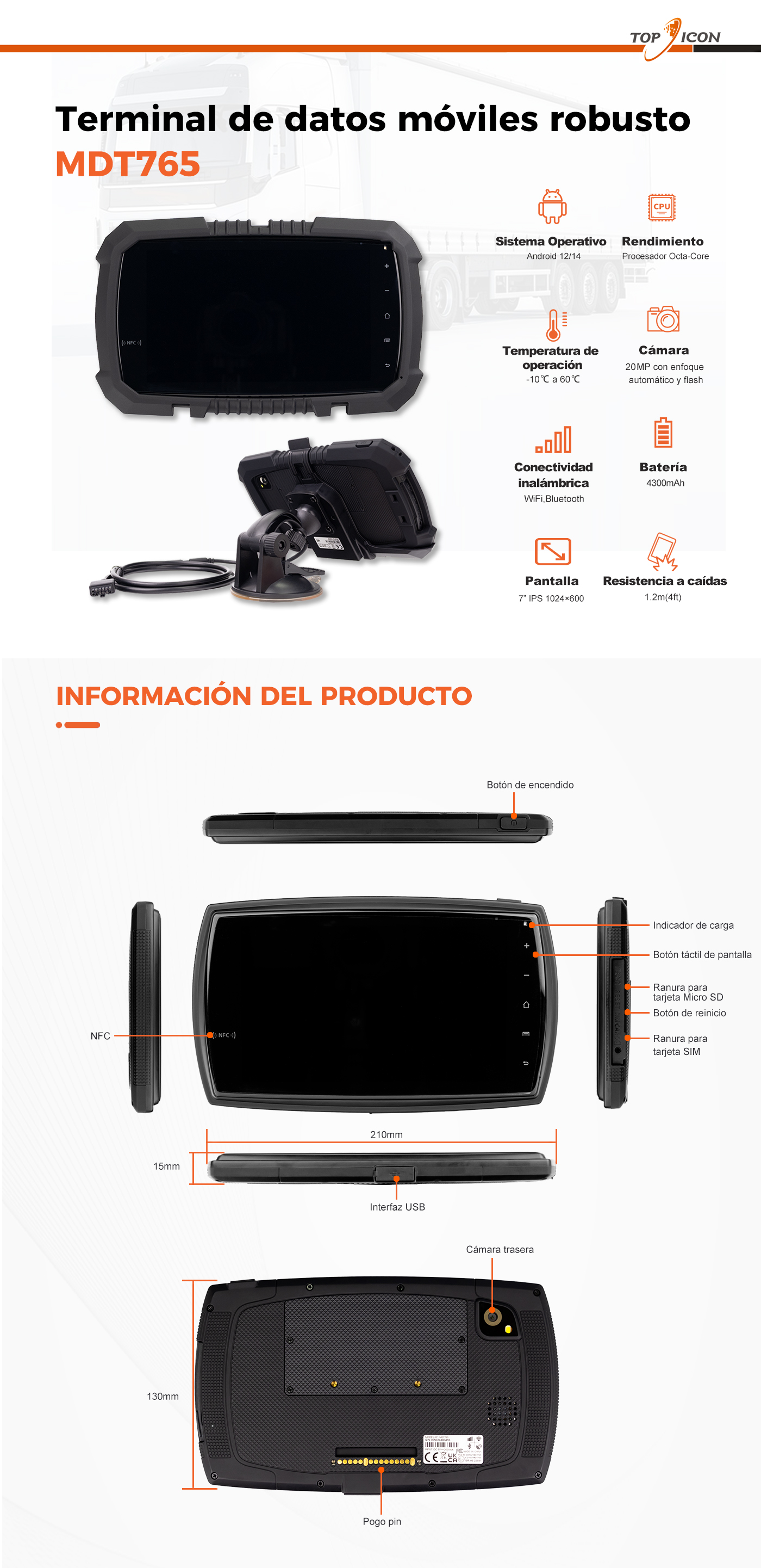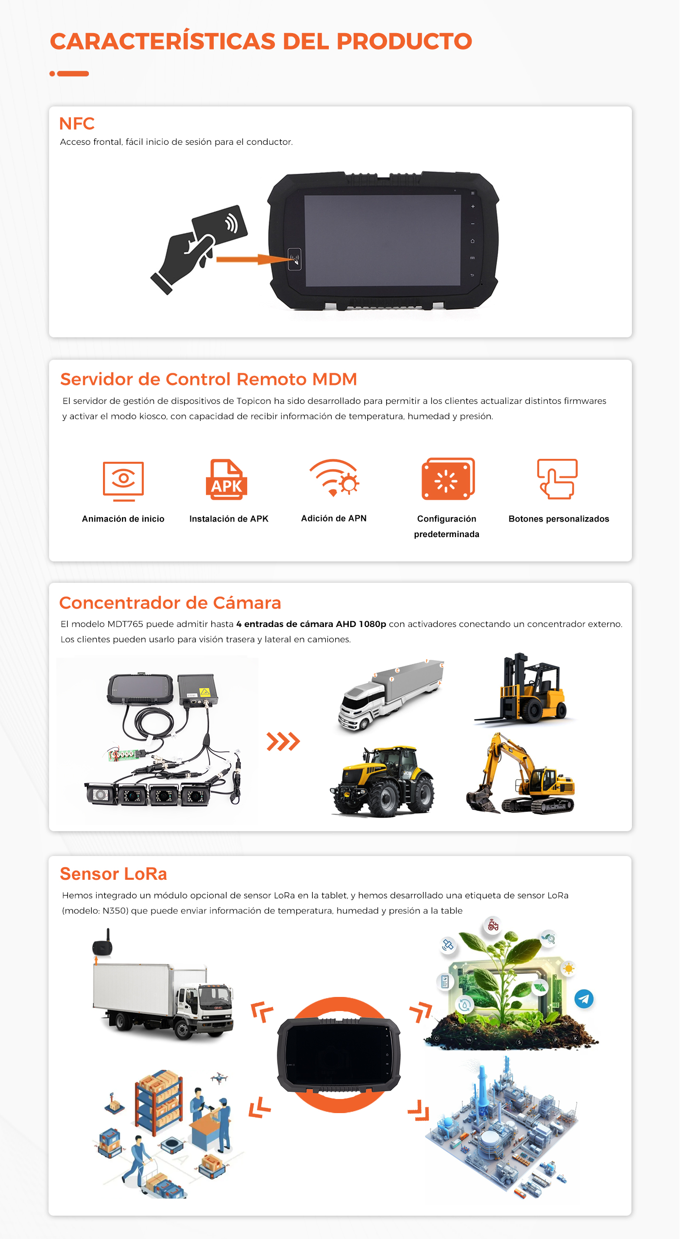 Incluye una pantalla TFT de 7", módulo de red móvil 2G/3G/4G y lector de tarjetas NFC. Opción de LoRa y sistema de cámara. Admite entrada de cámara AHD de hasta 4x1080p. Al combinarse con el concentrador de cámaras TOPICON, el conductor del camión puede usarla con vista real y lateral para garantizar la seguridad. Gracias a su base dedicada, permite el intercambio de datos con la interfaz RS232 del vehículo. Su avanzado chip GPS aumenta la precisión de la navegación.