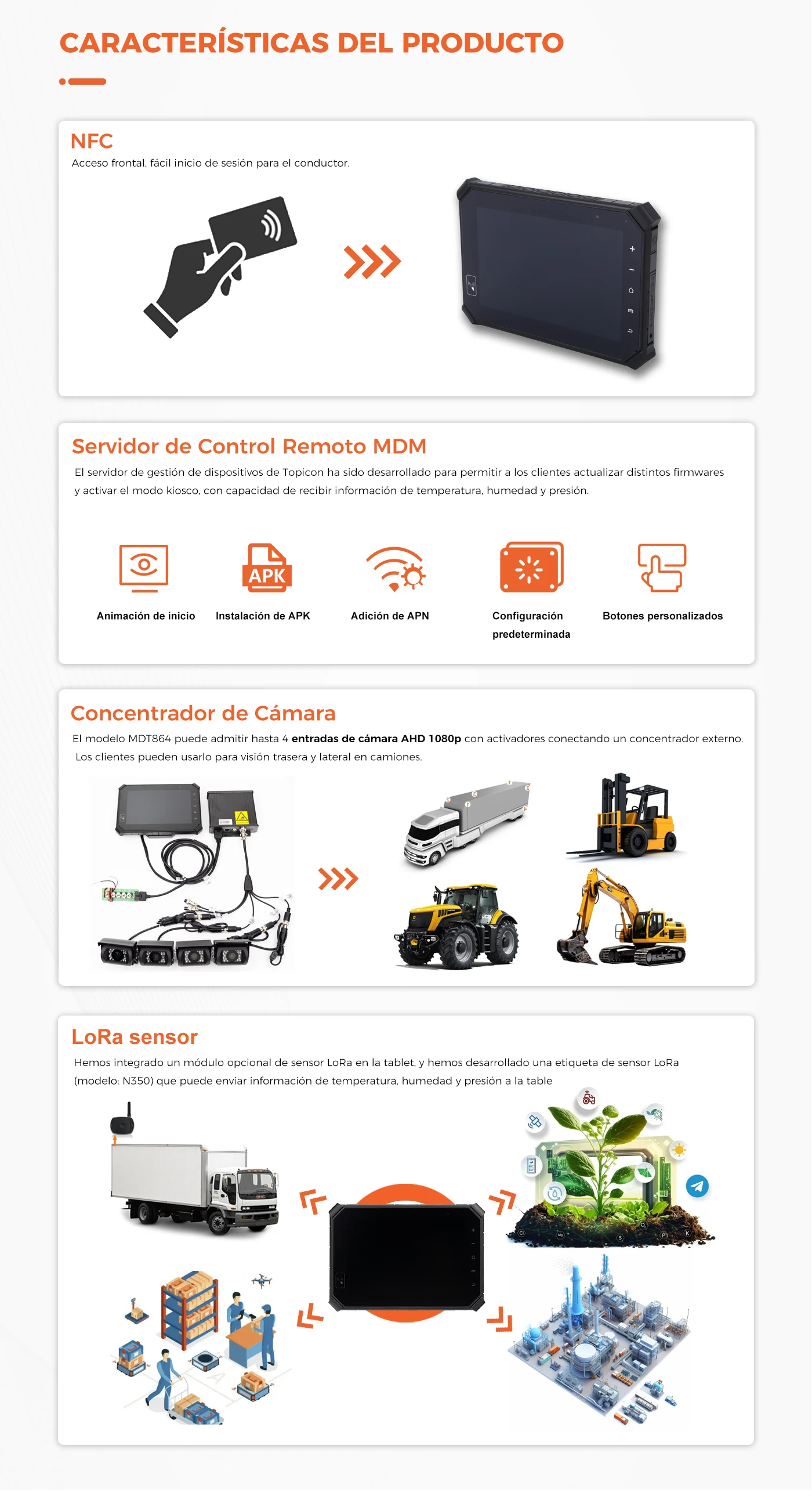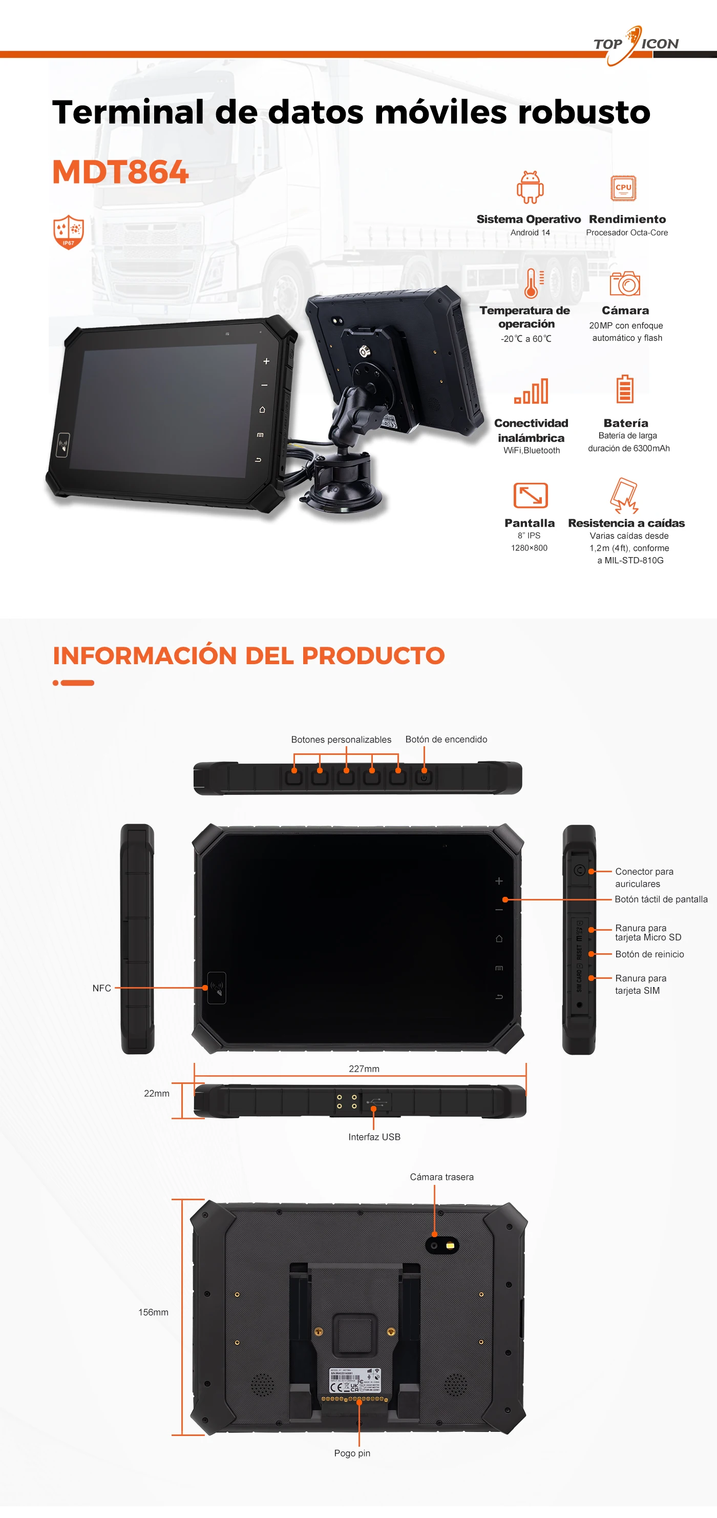 La MDT864 es una tableta de alto rendimiento con pantalla de 8" y certificación IP67. Equipada con procesador de ocho núcleos, chipset GPS avanzado, módulo 4G/3G/WLAN, RFID, Bluetooth, cámara y compatible con personalización de hardware.