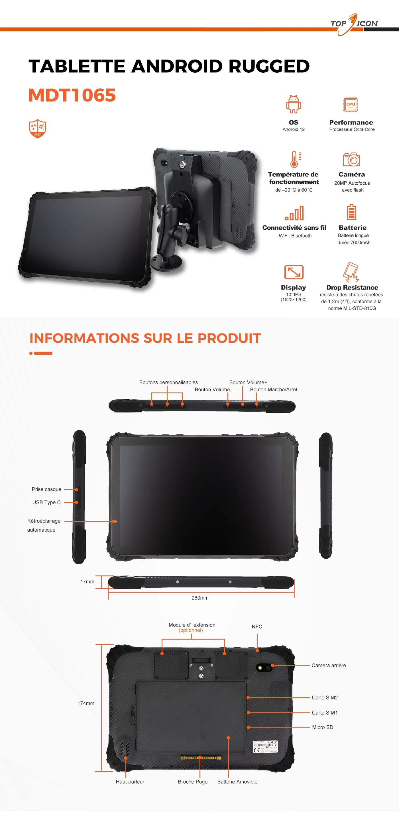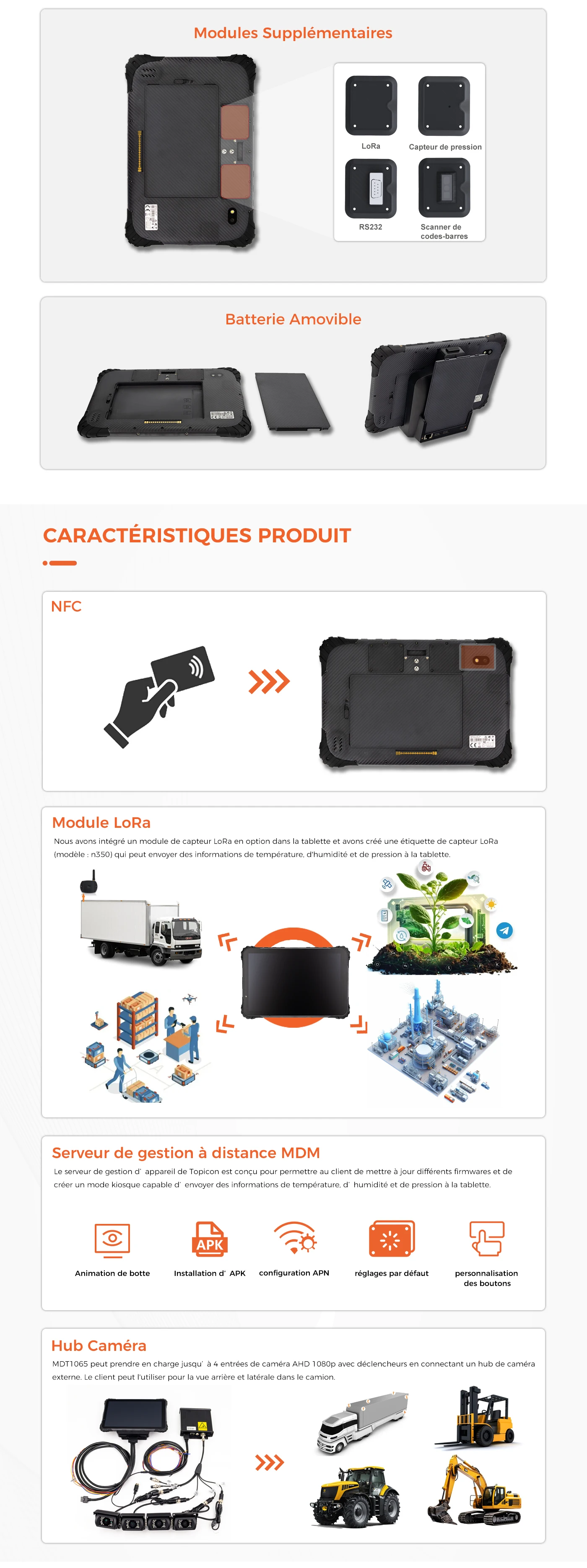 Le MDT1060/1065 est une tablette hautes performances avec écran 10", certifiée IP67. Elle est équipée d'un processeur octa-core, d'un chipset GPS avancé, d'un module 4G/3G/WLAN, de la technologie RFID, du Bluetooth, d'un appareil photo et de la personnalisation matérielle. Batterie remplaçable, recharge possible depuis le véhicule ou sur une station de charge.