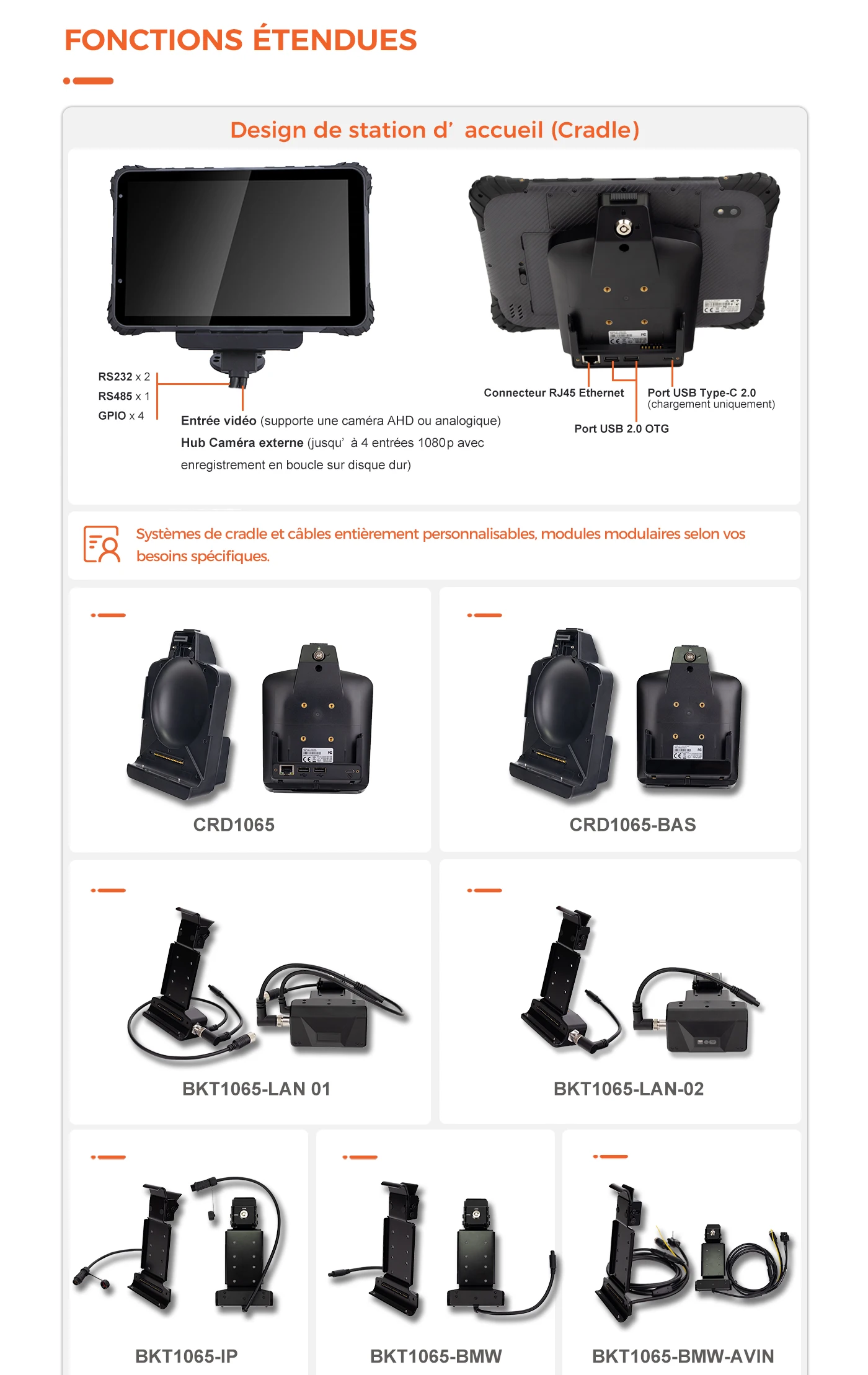 1 unité principale et 1 support (support de véhicule ou station d'accueil de bureau), 1 support RAM, 1 câble USB, 1 chargeur de voiture haute puissance, 1 carte NFC, 1 adaptateur domestique haute puissance, 1 câble de type C pour adaptateur domestique