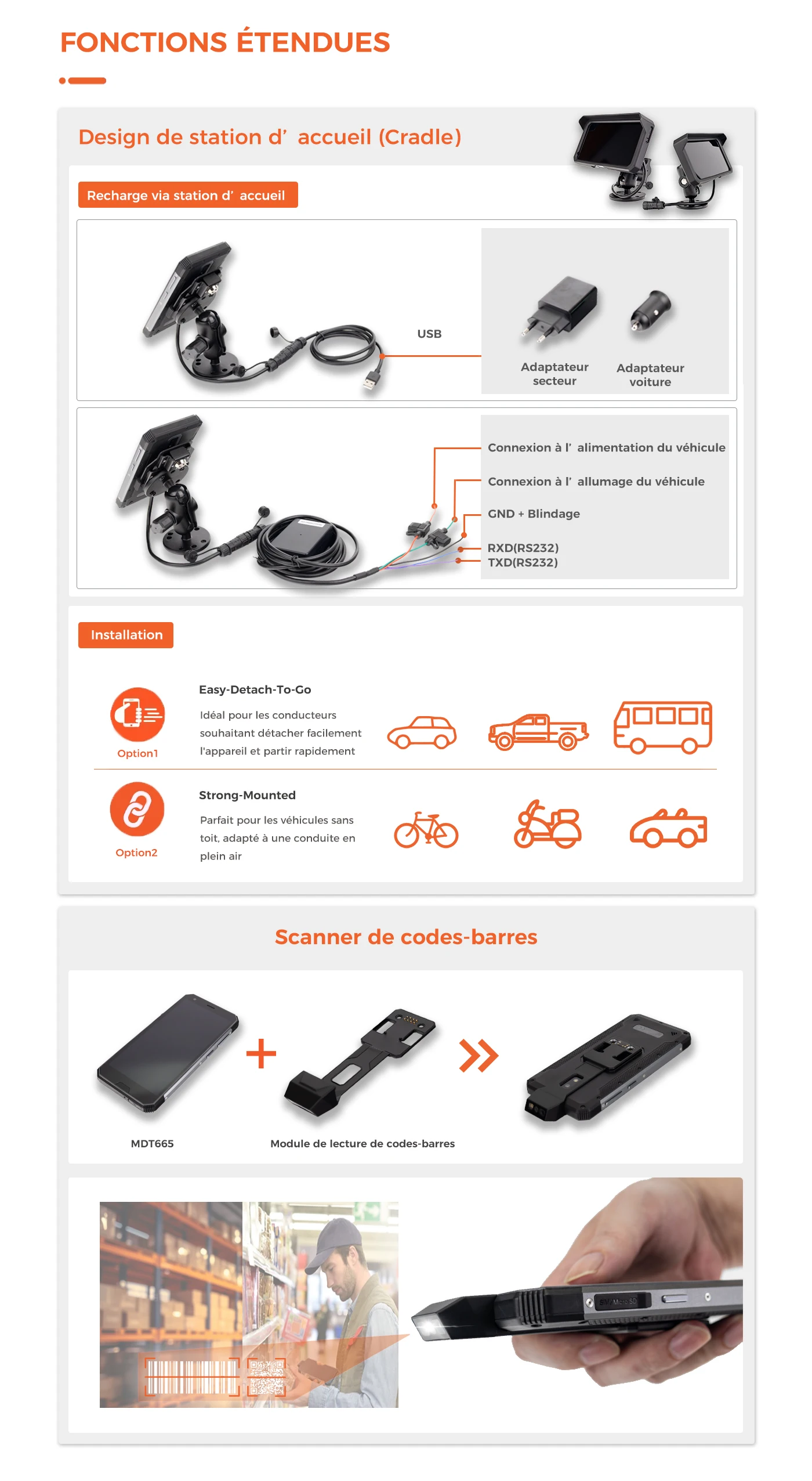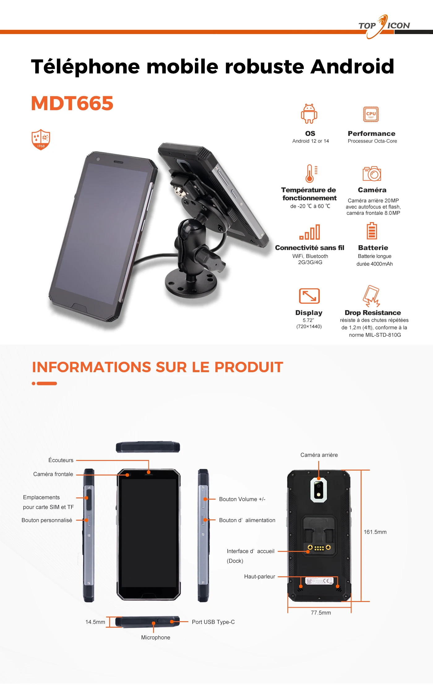 Le MDT665 est un terminal portable Android robuste et compact de 5,72 pouces. Idéal pour la logistique, la vente au détail et les entrepôts, il prend en charge la lecture de codes-barres, les supports et les fixations sécurisées.