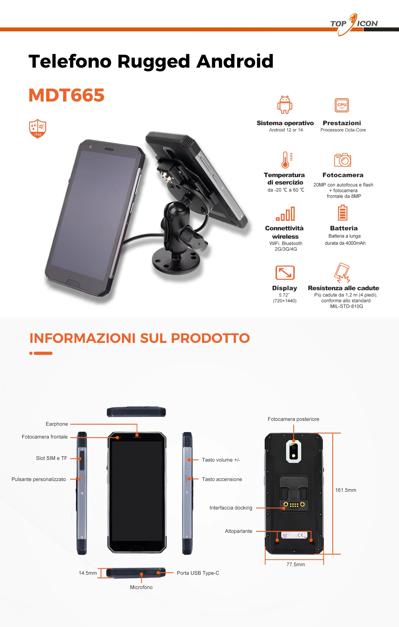 MDT665 è un terminale palmare Android robusto e compatto da 5,72 pollici. Ideale per logistica, vendita al dettaglio e magazzino, supporta la scansione di codici a barre, supporti e supporti di sicurezza.