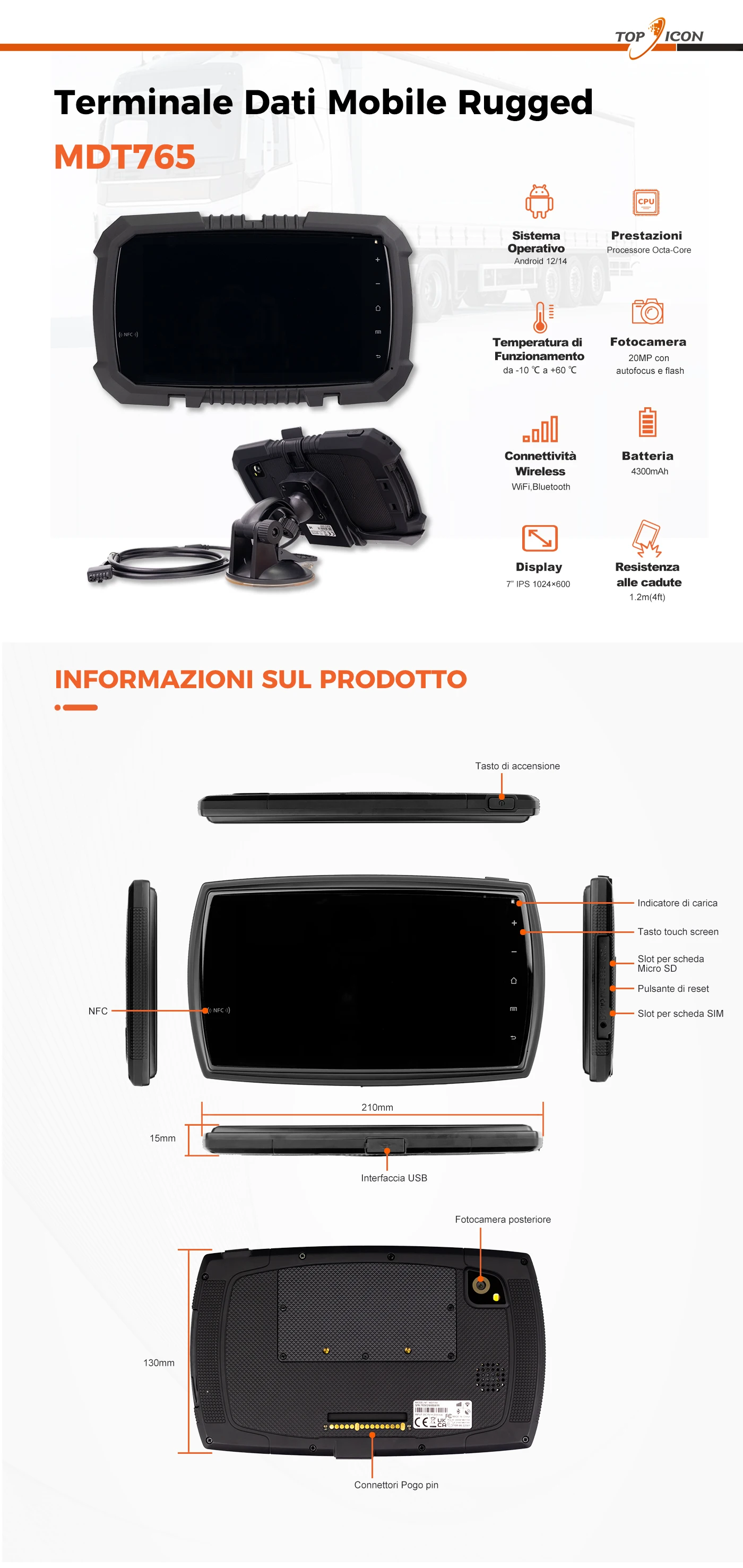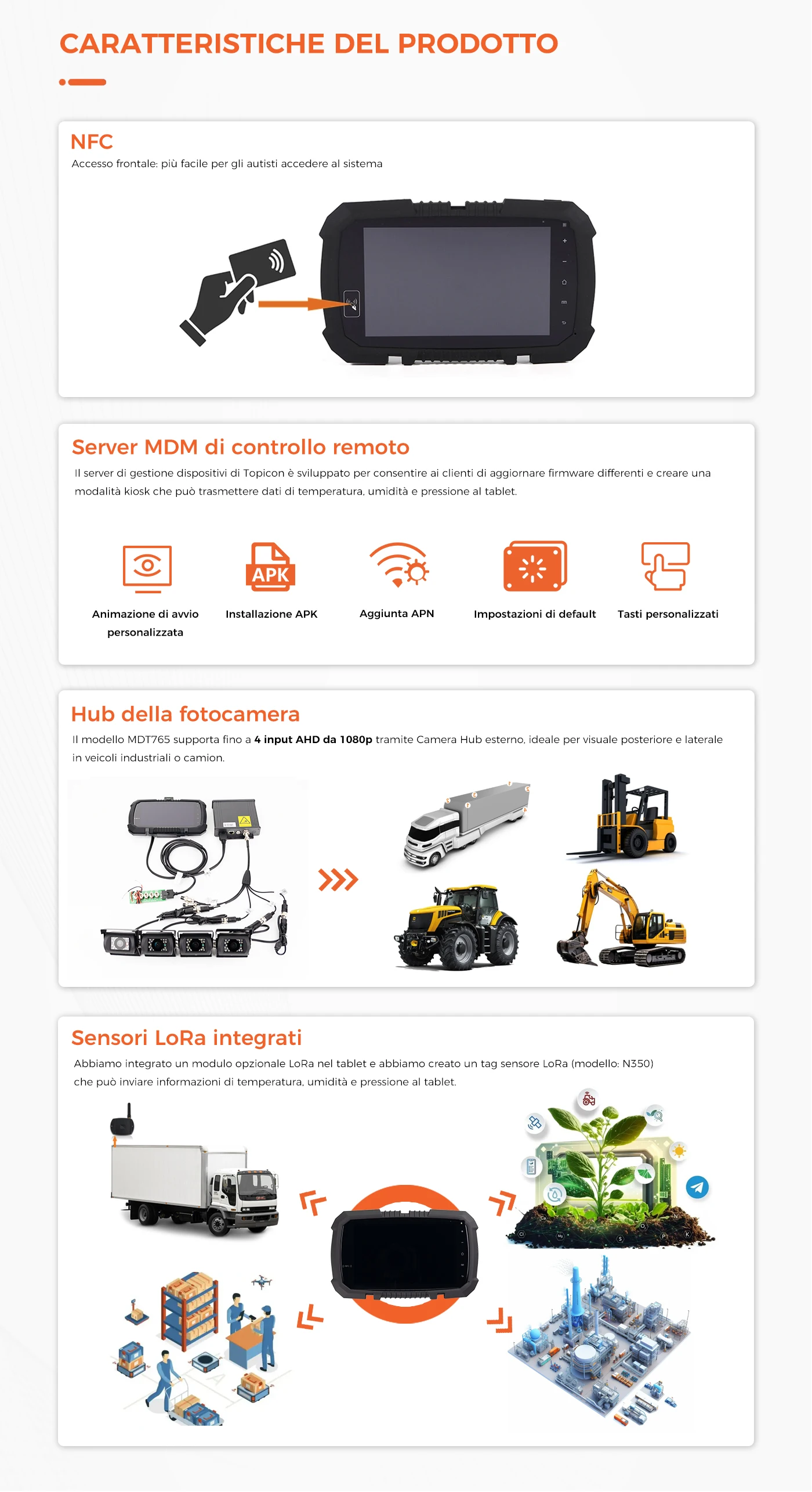 È dotato di display TFT da 7", modulo di rete mobile 2G/3G/4G e lettore di schede NFC. Con l'opzione LoRa e sistema di telecamere. Supporta fino a 4 ingressi telecamera AHD 1080p in combinazione con il dispositivo hub telecamera TOPICON, consentendo all'autista di camion di utilizzare il tablet per la vista reale e laterale per garantire la sicurezza. Grazie alla base dedicata, supporta lo scambio di dati con l'interfaccia RS232 del veicolo. Il chipset GPS avanzato rende la navigazione più precisa.