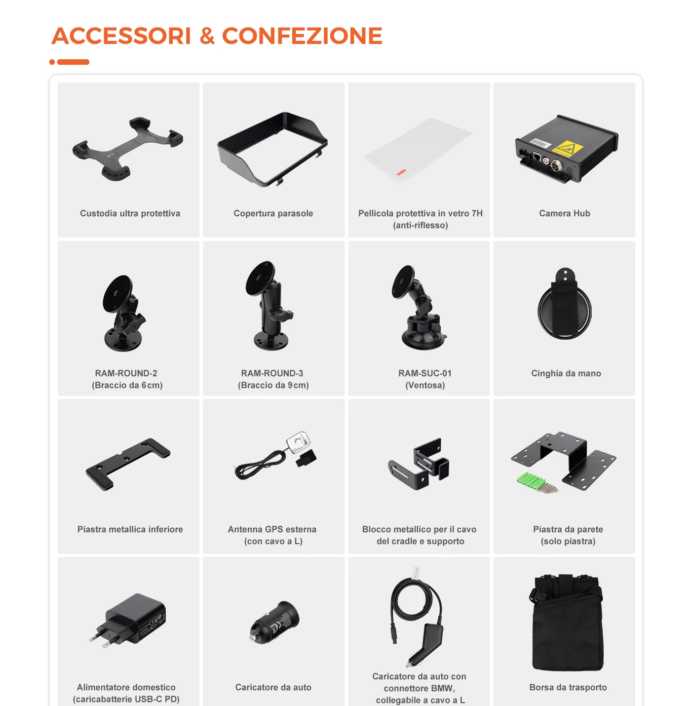 1 unità principale e 1 supporto (supporto per veicolo o dock station da tavolo). 1 supporto RAM, 1 cavo USB, 1 caricabatteria per auto ad alta potenza, 1 scheda NFC, 1 adattatore domestico ad alta potenza, 1 cavo di tipo C per adattatore domestico.