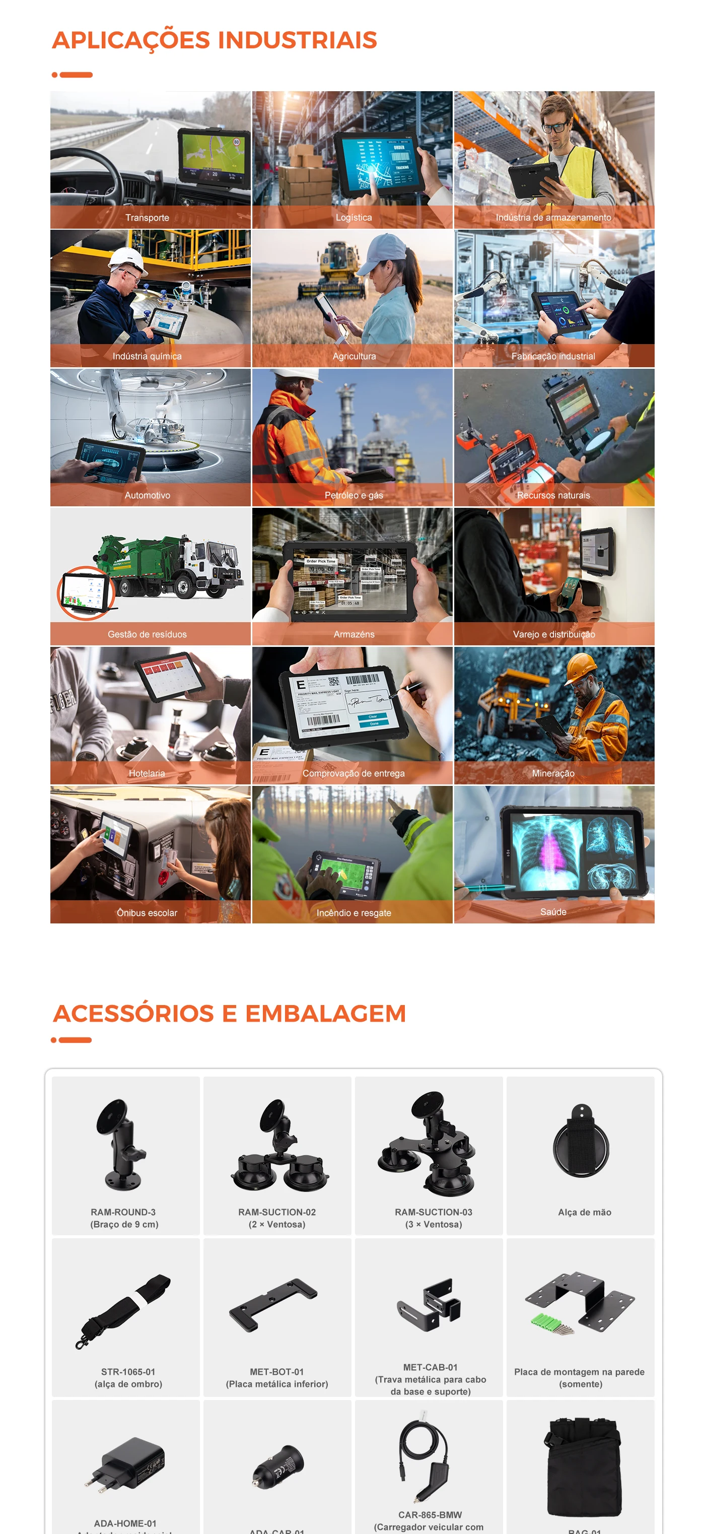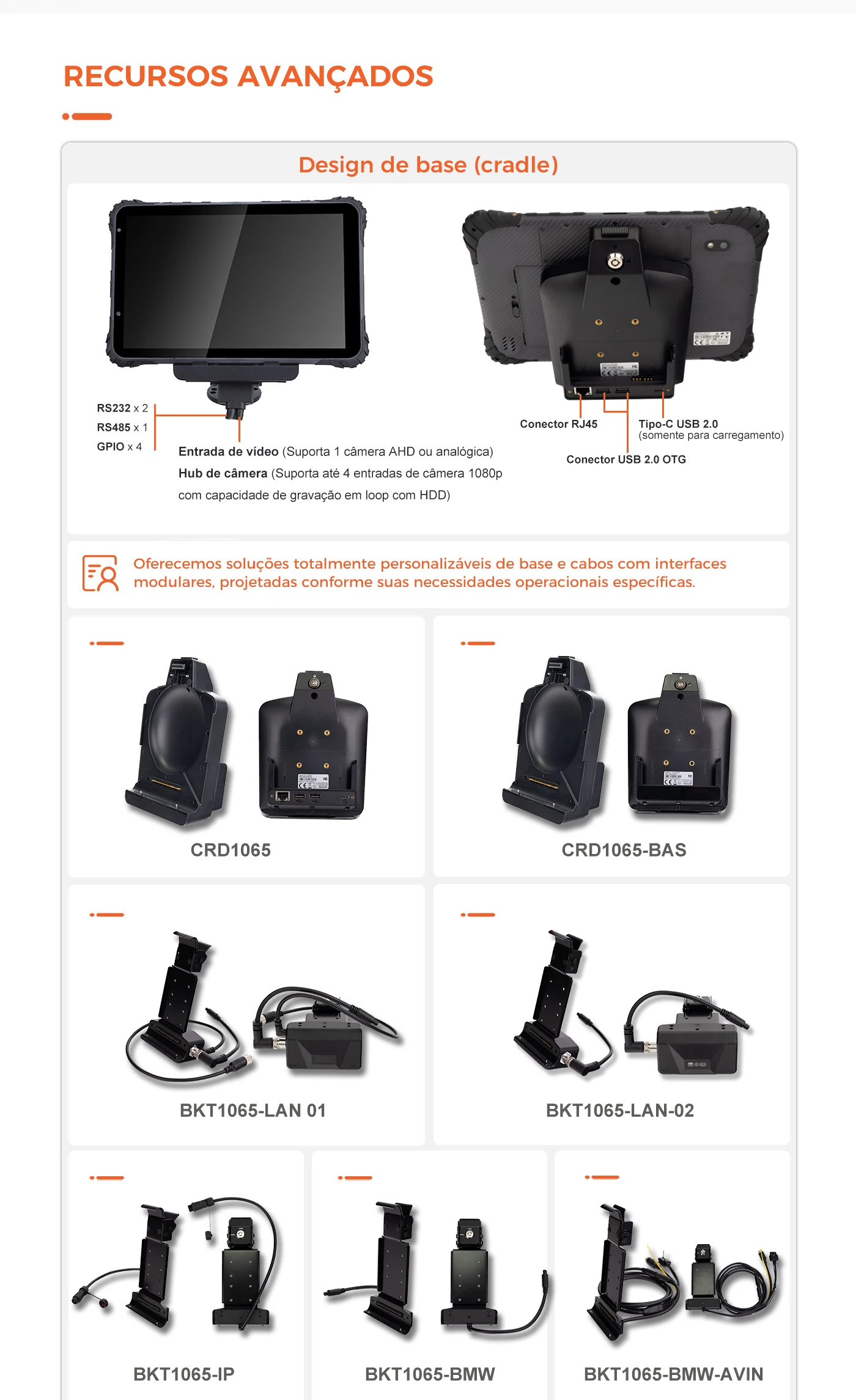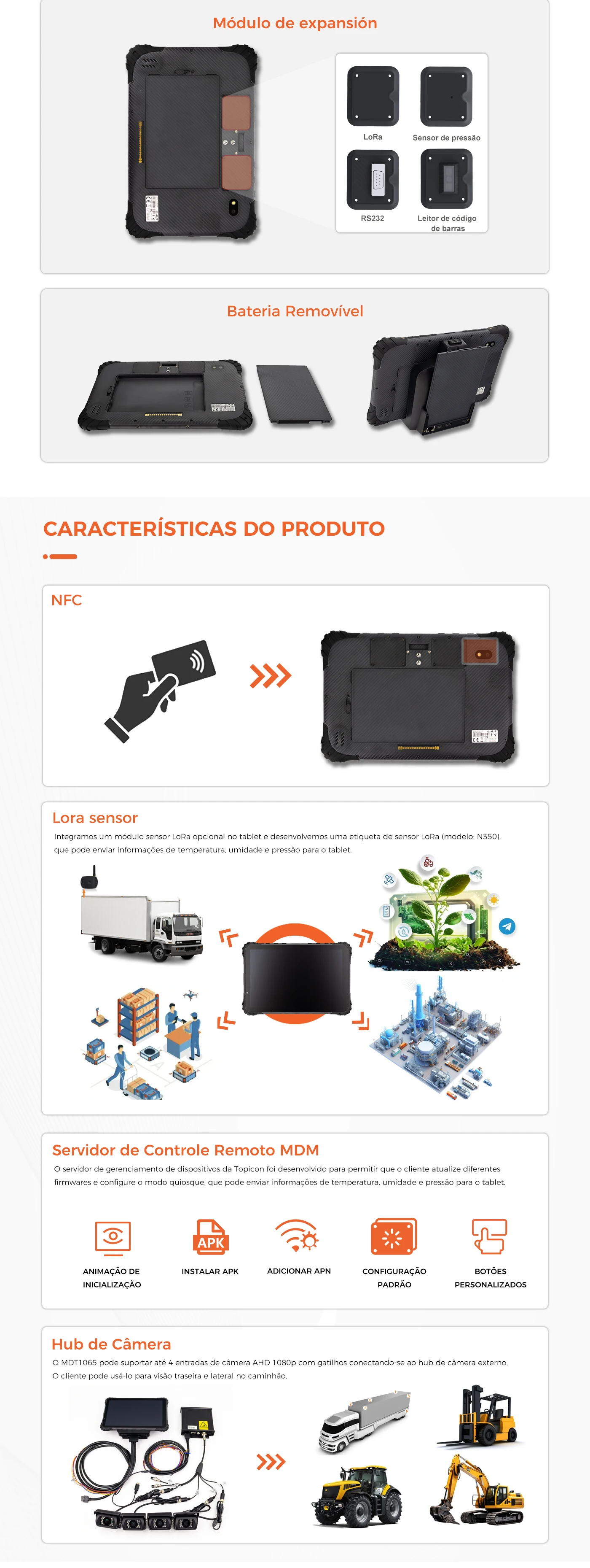 O MDT1065 é um tablet Android robusto de 10 polegadas com proteção IP67. Concebido para armazéns, operações de campo e transporte, com suporte para bases e soluções de montagem.