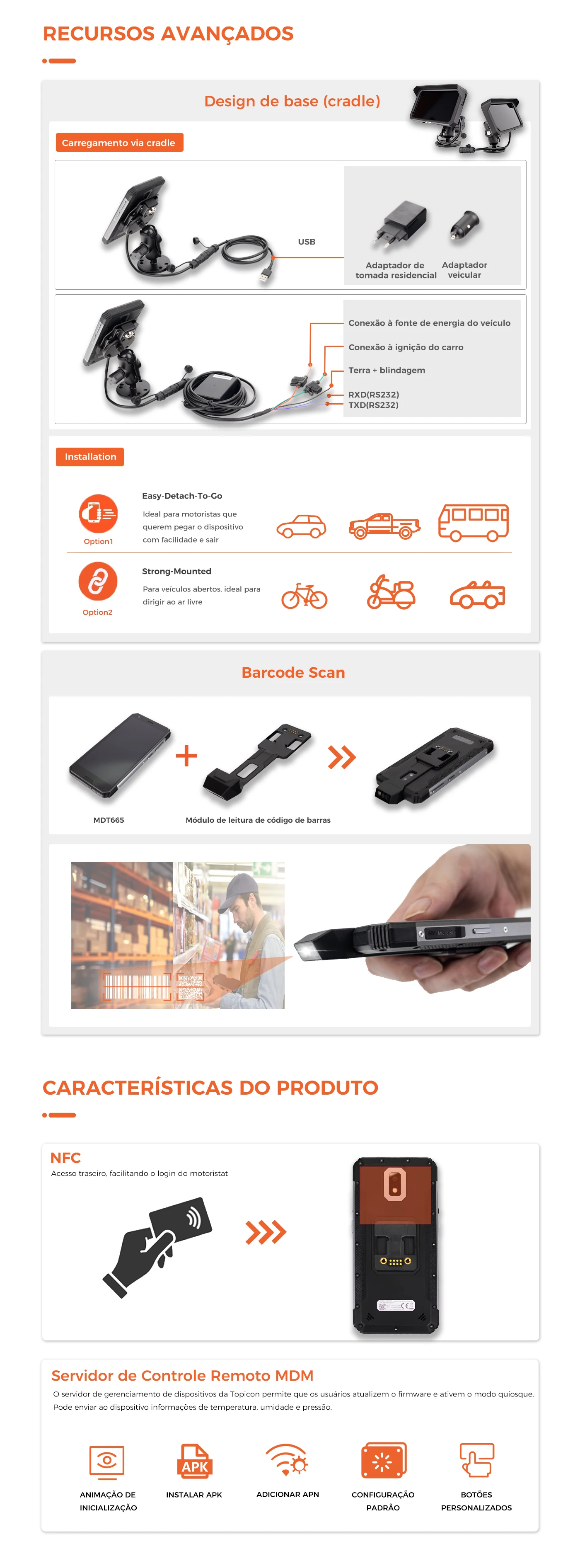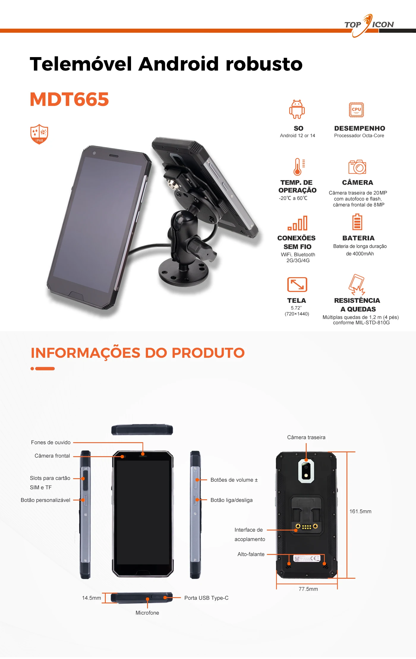 O MDT661 é um terminal portátil Android compacto e robusto de 5,72 polegadas. Ideal para operações de logística, retalho e armazém, com suporte para leitura de código de barras, suportes e montagens seguras.