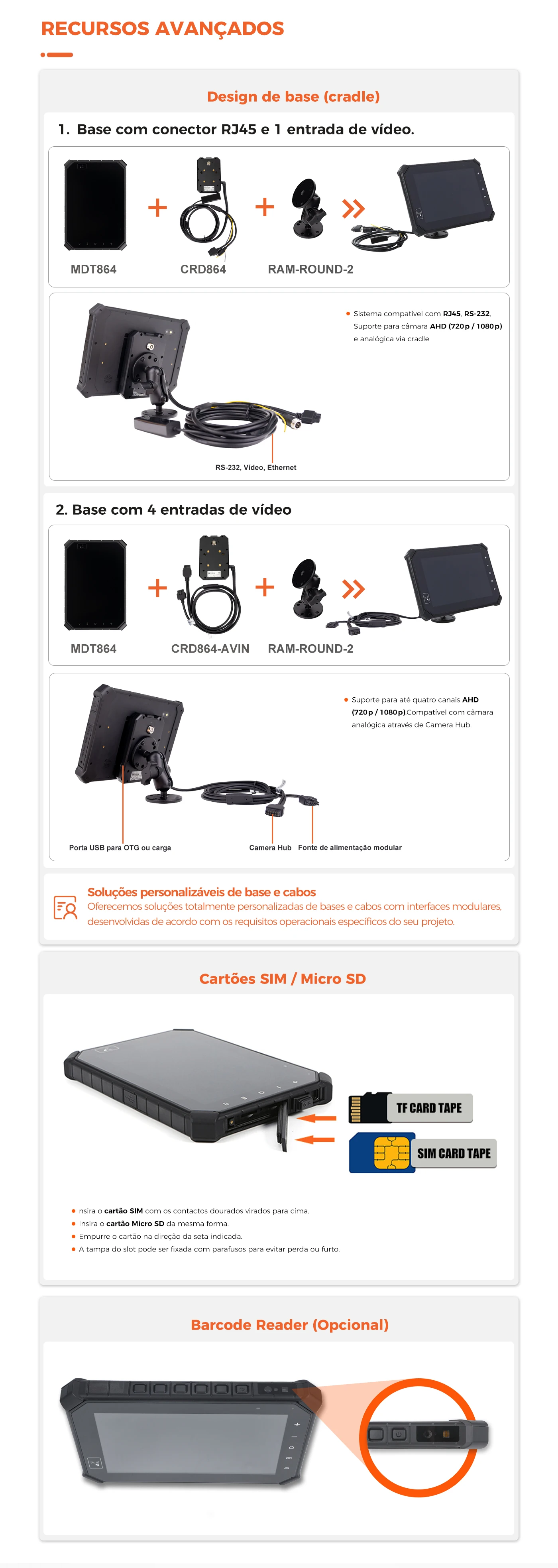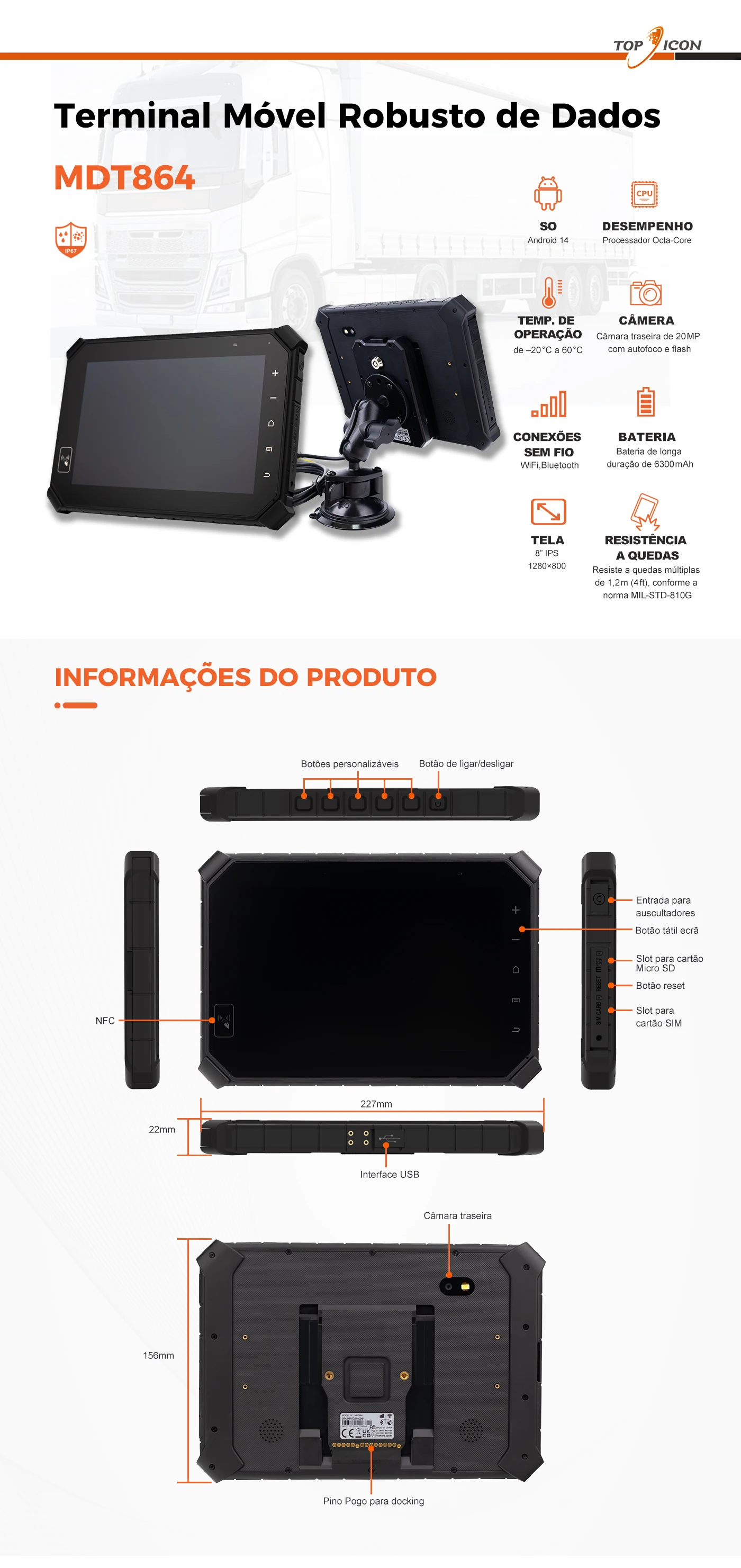 O MDT864 é um terminal tablet de alto desempenho com ecrã de 8" e classificação IP67. Equipado com processador octa-core, chipset GPS avançado, módulo 4G/3G/WLAN, com RFID, Bluetooth, câmara e suporte para personalização de hardware.
