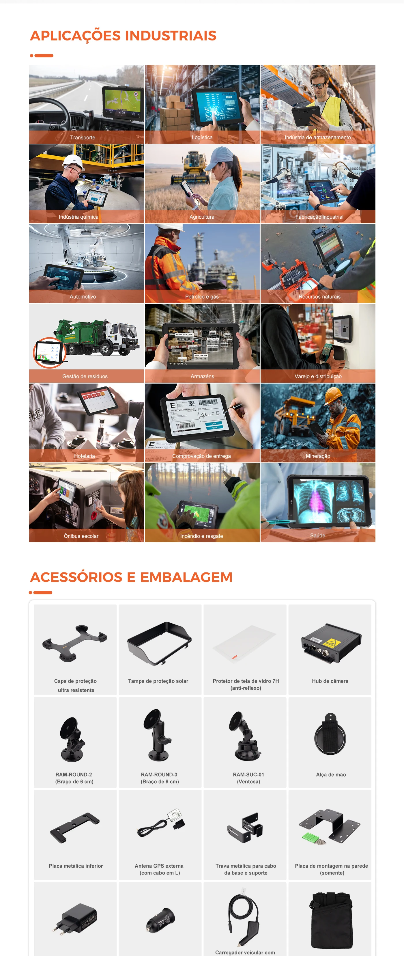 1 unidade principal e 1 base (base para veículo ou estação de acoplamento de mesa). 1 suporte de RAM, 1 cabo USB, 1 carregador de isqueiro de alta potência, 1 cartão NFC, 1 adaptador de casa de alta potência, 1 cabo tipo C para adaptador de casa
