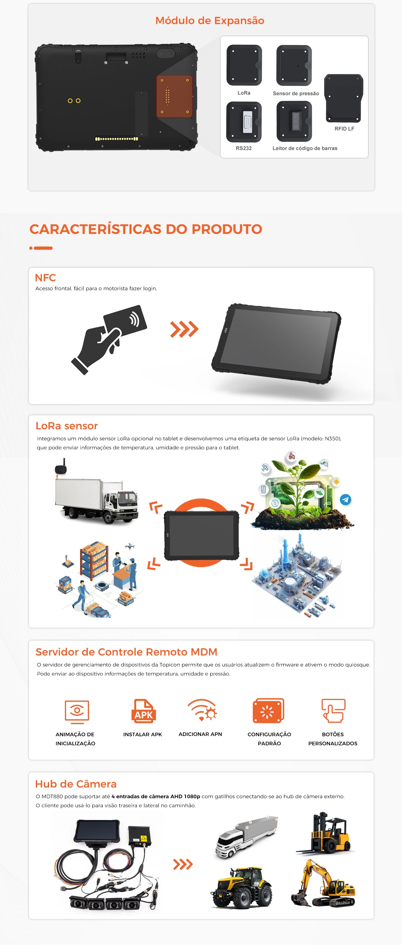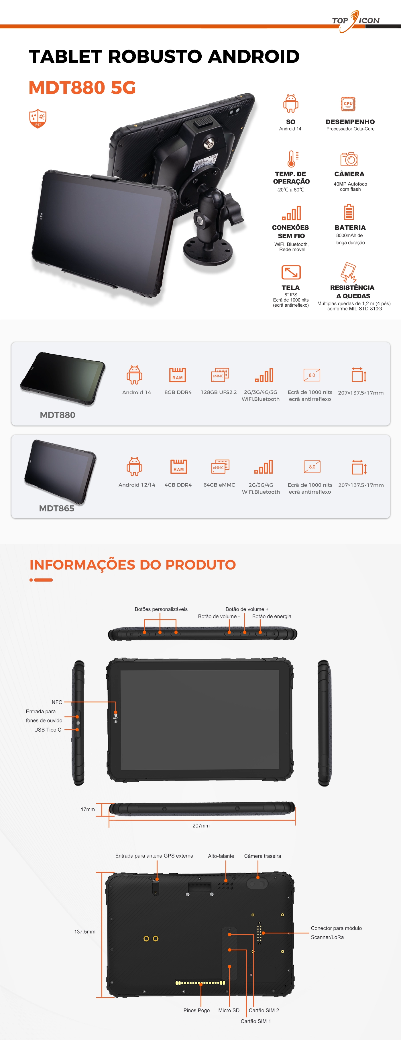 Conector USB Tipo C: Ligação USB 2.0 e carregamentoPinos Pagos: Suporta porta série, USB, entrada 12V/24V, iqnition, eepromRanhura para cartão SlM: Sim, dois nano SlM
